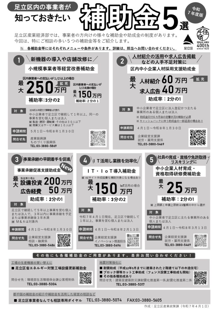 足立区産業経済部では、区内事業者の皆さまを対象に、さまざまな補助金・助成金制度を設けています。
