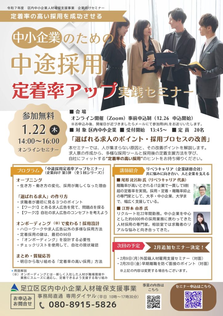 本セミナーでは、人が集まらない原因とその改善ポイントを解説します。求人票の作成から、多様な採用ツールと採用後の定着支援方法を学び、自社にフィットする、”定着率の高い採用”のヒントをお持ち帰りください。